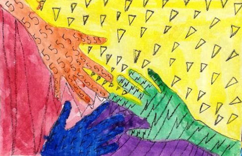 Color is my favorite element of art! I was trying to think of a way to teach color theory without having to do the same old color wheel, while at the same time covering more elements and principles. I enjoy hand art and came up with this crayon resist hand line design. The students traced their hand three times with only one finger touching another finger on a second hand. Done right, you will end up with six different sections. From there we talked about line, shape, pattern, and variety/visual interest. I instructed them to fill in each section with a different pattern using lines and shapes while showing variety. They all started with pencil so that I could observe and make sure they were all on the right path.
